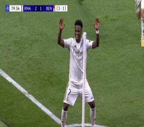 比賽第80分鐘,維尼修斯接巴爾韋德直塞后高速突破,在大禁區(qū)線上冷靜低射遠(yuǎn)角得手,將比分鎖定為2-1。這一進(jìn)球徹底澆滅了本菲卡翻盤的希望。進(jìn)球后,維尼修斯迅速奔向角旗區(qū),做出了與首回合客場對陣本菲卡時(shí)完全相同的舞蹈慶祝動作。