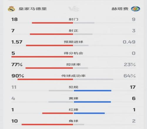 賽后的數(shù)據(jù)統(tǒng)計荒誕得像個笑話:皇馬控球率77%,射門18次,射正7次,預期進球(xG)高達1.57,角球10個;而赫塔費呢?控球率僅23%,射門9次,射正3次。