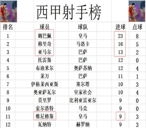 射手榜方面,傷缺的姆巴佩還是23球領(lǐng)跑,穆里奇16球排在第2,亞馬爾13球第3,托雷斯,布迪米爾12球并列第4。維尼修斯今天錯(cuò)失超級(jí)單刀,還是和莫里羅,索爾洛特,瓦納特9球剛好擠入前十。