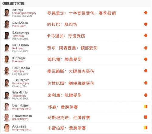 如果說巴薩傷病嚴(yán)重,那他們的競爭對手皇馬就是超級嚴(yán)重。周一晚主場0比1不敵赫塔費(fèi)一役,懷森和卡雷拉斯均吃到黃牌停賽,馬斯坦托諾比賽結(jié)束前也拿到紅牌,可能停賽一到兩場。更嚴(yán)重的是帶傷堅(jiān)持踢了幾十分鐘的羅德里戈賽后被診斷右膝十字韌帶和外側(cè)半月板受傷,不僅本賽季提前報(bào)銷,還無法參加今年世界杯。