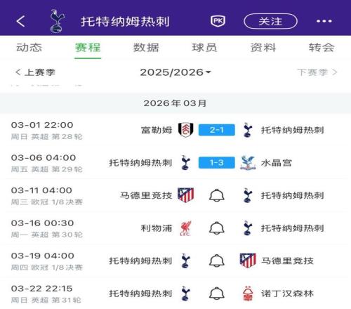 北京時間3月6日,英超第29輪,托特納姆熱刺1-3水晶宮。在本場比賽之后,熱刺將迎來一段艱難的賽程。