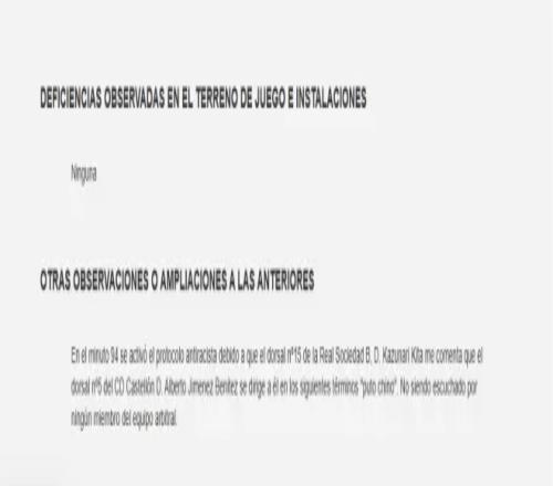 裁判報(bào)告中寫道:“第94分鐘,反種族主義程序啟動(dòng),因皇家社會(huì)B隊(duì)15號(hào)球員喜多壱也向我反映,卡斯迪隆5號(hào)球員阿爾貝托·希門尼斯以‘該死的中國(guó)佬’稱呼他。裁判組其他成員都沒聽見這句話?!?/p>