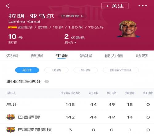 據(jù)德轉(zhuǎn)數(shù)據(jù)顯示,年僅18歲的亞馬爾至今各項(xiàng)賽事為巴薩一線隊(duì)出戰(zhàn)142場(chǎng),貢獻(xiàn)44球49助,同時(shí)他在西班牙國(guó)家隊(duì)也有著23場(chǎng)6球12助的數(shù)據(jù)。也就是說(shuō),亞馬爾職業(yè)生涯165場(chǎng)已有50球61助,要知道,他現(xiàn)在僅僅18歲而已。