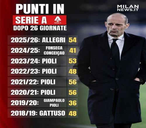 北京時間2月24日,米蘭新聞網(wǎng)統(tǒng)計出了AC米蘭近8個賽季意甲前26輪過后的成績,本賽季阿萊格里率隊拿到54分為近8個賽季的第二高積分。