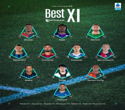 北京時間2月24日,意甲官方評選出了意甲第26輪的最佳11人陣容,莫伊塞-基恩、貝拉爾迪、克里斯坦特、貝爾納代斯基和阿坎吉入選。