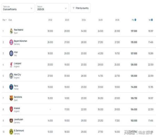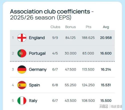 當然了,歐洲三大杯也有權重之分,歐冠的獎勵權重,比歐聯(lián)杯和歐協(xié)聯(lián)都會高一些。同一個聯(lián)賽所有球隊的積分合計,再除以總參賽球隊數量,就得出該聯(lián)賽的積分。