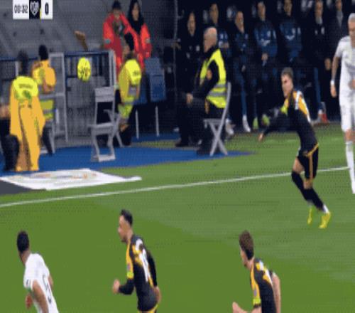第16分鐘,庫尼亞在昆卡的拉拽之下進入禁區(qū)后倒地,裁判第一時間判罰點球。但通過慢鏡頭可以看到,昆卡在庫尼亞進入禁區(qū)前已經(jīng)放手,裁判改判任意球。