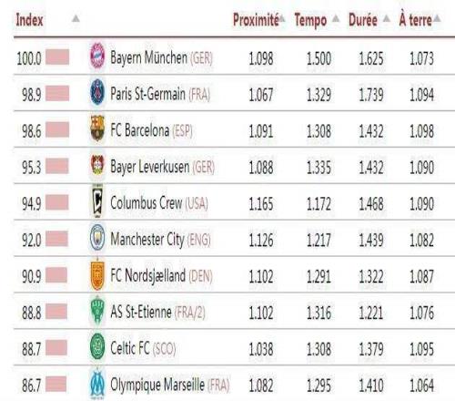 知名數(shù)據(jù)評測機構(gòu)足球天文臺(CIES)基于合作伙伴Impect的數(shù)據(jù),結(jié)合58個主流聯(lián)賽公布了全球最具“控球主導、傳控風格”的球隊排名,拜仁以100分的基準分登頂榜首,巴黎巴薩分列二三位。數(shù)據(jù)核心排名標準通過以下四項技術(shù)指標綜合評定:傳球距離(越短越好)、控球階段的傳球速度、平均單次控球時長,以及在前場三分之一區(qū)域,膝蓋以下接球的百分比。排名第一的拜仁獲得了100分的綜合評分(即其他球隊以拜仁的100分作為綜合指標),巴黎、巴薩作為二、三名分獲98.9和98.6分。第4-10名分別為:勒沃庫森(德甲)、哥倫布機員(美職聯(lián))、曼城(英超,92分)、北西蘭(丹麥超)、圣埃蒂安(法乙)、凱爾特人(蘇超)、馬賽(法甲)。11-20名分別為:布拉加(葡超)、博德閃耀(挪超)、吉達聯(lián)合(沙特聯(lián))、皇馬(西甲,84分)、哈馬比(瑞典超)、圣地亞哥(美職聯(lián))、錫爾克堡(丹麥超)、利物浦(英超,81.9分)、洛杉磯FC(美職聯(lián))和埃爾切(西甲)