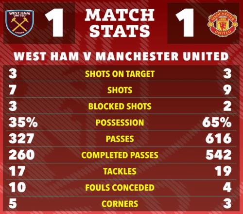 努諾·桑托的西漢姆采用541陣型密集防守,曼聯(lián)掌控球權(quán),但似乎不知道如何是好,高達65%的控球率,卡里克的球隊只轉(zhuǎn)化為3次有效射門。