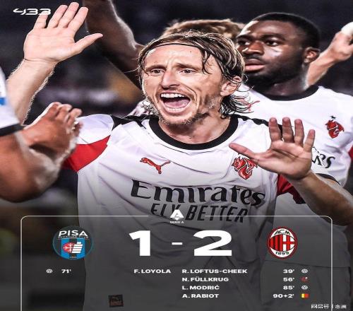 意甲第25輪,AC米蘭2-1擊敗比薩,暫落后榜首5分。奇克破門(mén)首開(kāi)紀(jì)錄。拉比奧打進(jìn)一球但是因菲爾克魯格手球犯規(guī)在先被吹,菲爾克魯格罰丟點(diǎn)球,洛約拉扳平,40歲的莫德里奇破門(mén),拉比奧兩黃一紅被罰下。