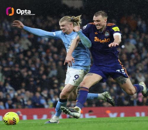 哈蘭德對陣紐卡贏下12次對抗,為個人在五大聯(lián)賽單場最高數(shù)據(jù)
