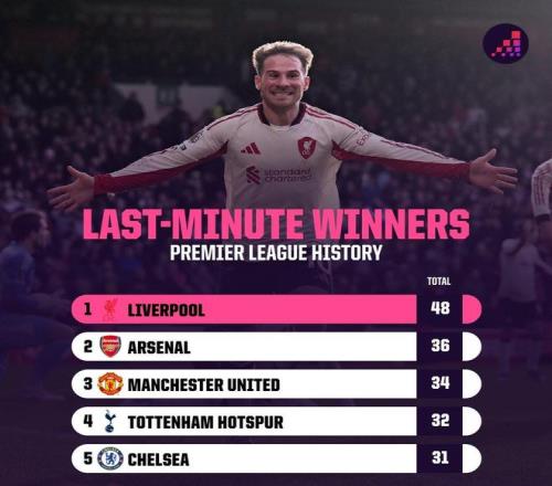 英超第90分鐘后制勝球榜:利物浦48次居首,阿森納36次第二