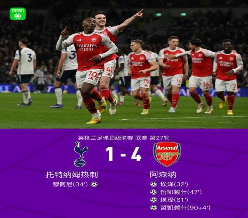北京時間2月23日0:30,英超第27輪迎來北倫敦德比,托特納姆熱刺坐鎮(zhèn)主場迎戰(zhàn)阿森納,本場主裁判為彼得-班克斯。上半場,埃澤凌空斬首開記錄,緊接著穆阿尼抓住賴斯失誤破門閃電扳平。下半場,哲凱賴什遠射破門,穆阿尼進球被吹,埃澤再下一城梅開二度;補時階段,哲凱賴什再入一球也雙響。最終,阿森納4-1聯賽雙殺熱刺。