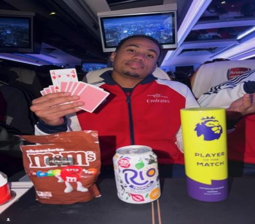 賽后,加布里埃爾曬出他在球隊(duì)大巴上的照片,照片中前方放著英超官方全場(chǎng)最佳球員獎(jiǎng)杯,這位阿森納后衛(wèi)手里還拿著撲克牌,并特意亮出了紅桃4(可能代表他最近4次英超北倫敦德比出場(chǎng)都當(dāng)選全場(chǎng)最佳)。