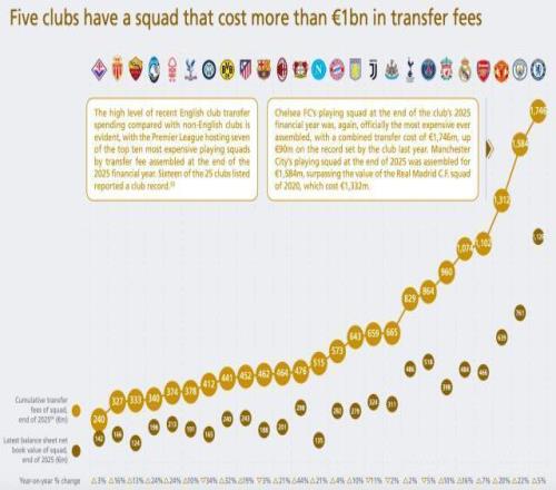 歐洲足壇目前共有5家10億俱樂部,英超占2025財年末身價排名前10的球隊中的7支。上榜的25家俱樂部中有16家刷新了俱樂部歷史最高紀錄。切爾西在2025財年末的陣容身價再次創(chuàng)下新高,總轉會費高達17.46億歐元,比他們去年創(chuàng)下的紀錄高出9000萬。