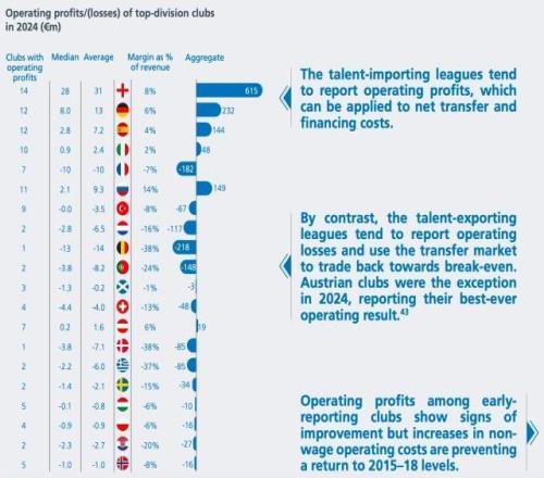 報告指出,人才引進型聯(lián)賽往往盈利,這些利潤可用于支付凈轉會費和融資成本。相比之下,人才輸出型聯(lián)賽往往運營虧損,并利用球員買賣以期實現(xiàn)收支平衡。