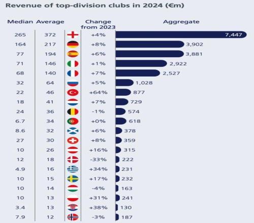 收入排名前20的聯(lián)賽中,有16個聯(lián)賽在2024年實現(xiàn)了收入增長。英格蘭俱樂部繼續(xù)創(chuàng)造最多的收入,盡管其收入占比從27%下降到26%。德國俱樂部的收入中位數(shù)是西班牙、意大利或法國俱樂部的兩倍多。