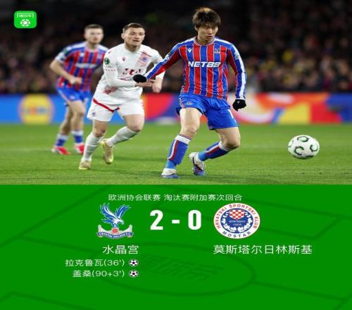 北京時間2月27日歐洲協(xié)會聯(lián)賽 淘汰賽附加賽次回合,水晶宮對陣莫斯塔爾日林斯基。水晶宮拉克魯瓦破門,蓋桑破門。最終比分水晶宮 2-0 莫斯塔爾日林斯基。兩回合總比分水晶宮3-1莫斯塔爾日林斯基。