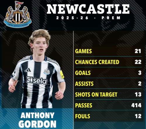 戈登身高1米83,司職左邊鋒,也能踢中鋒。2025-26賽季,戈登在英超21場貢獻(xiàn)3球2助,發(fā)揮起伏不定。不過在歐冠,戈登10次出場打進(jìn)10球,射手榜上僅次于13球的姆巴佩。戈登也是英格蘭現(xiàn)役國腳,代表三獅軍團(tuán)出場16次打進(jìn)2球,有望出戰(zhàn)2026年世界杯。