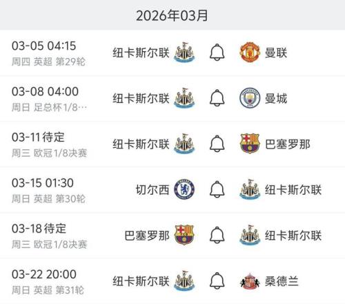 紐卡將在兩周時間里連續(xù)迎戰(zhàn)曼市雙雄、切爾西,并進行與巴薩的兩回合歐冠較量。3月最后一場比賽里,他們將在主場迎來東北德比對手桑德蘭。