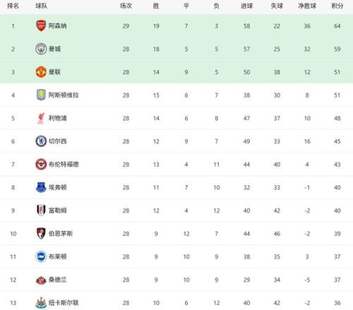 隨著阿森納21切爾西英超最新積分榜!曼聯(lián)沖到第3熱刺瀕臨降級