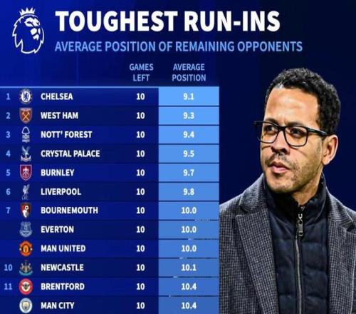 德轉(zhuǎn)統(tǒng)計(jì)英超剩余10輪各隊(duì)對(duì)手平均排名:切爾西賽程難度最高