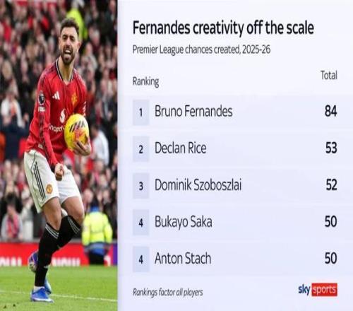 天空體育:B費(fèi)已創(chuàng)造84次機(jī)會,賴斯53次排名第2