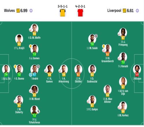 利物浦首發(fā):1-阿利松、6-凱爾凱茲(65’26-羅伯遜)、4-范戴克、5-科納特(79’14-基耶薩)、30-弗林蓬(72’2-戈麥斯)、38-赫拉芬貝赫(46’17-瓊斯)、10-麥卡利斯特、8-索博斯洛伊、18-加克波(65’73-恩古莫哈)、11-薩拉赫、22-?;倏?。