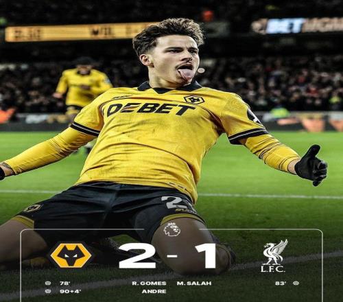 反倒是補(bǔ)時(shí)第94分鐘,阿利松開(kāi)大腳發(fā)動(dòng)最后一搏,球權(quán)卻被查舒亞斷下,安德烈?guī)蛲七M(jìn)到禁區(qū)前沿起腳遠(yuǎn)射,皮球擊中防守球員后折射入網(wǎng),2-1,狼隊(duì)完成了史詩(shī)般的絕殺,瞬間主場(chǎng)球迷沸騰,衛(wèi)冕冠軍利物浦就這樣轟然倒下。
