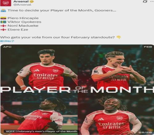 官方:阿森納公布了隊(duì)內(nèi)2月份最佳球員候選,包括埃澤、哲凱賴什、因卡皮耶和馬杜埃凱。