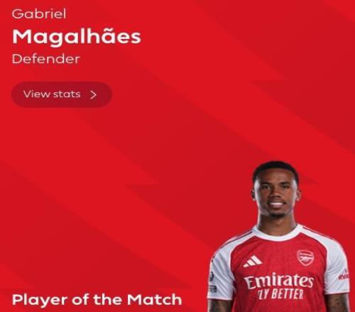 最終經(jīng)過英超官網(wǎng)球迷投票,加布里埃爾以59%的得票率當(dāng)選全場最佳球員。