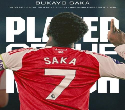 在今天凌晨進行的英超第29輪比賽中,阿森納客場1-0擊敗布萊頓,賽后,打入制勝進球的薩卡被阿森納官方評為本場比賽隊內(nèi)最佳球員。