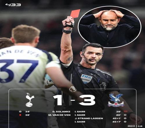 英超第29輪,熱刺主場1-3負于水晶宮,5連敗+11輪不勝,積29分僅領(lǐng)先降級區(qū)1分。薩爾進球被吹,索蘭克建功,范德芬送紅點,薩爾點射命中+雙響,拉爾森破門,丹索頭球攻門、索蘭克小角度射門被撲。