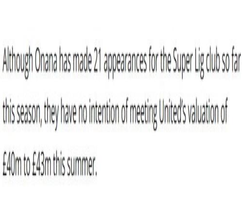 特拉布宗體育高層透露,曼聯(lián)為本賽季租借到該隊(duì)的門(mén)將安德烈·奧納納標(biāo)價(jià)4500萬(wàn)歐元到5000萬(wàn)歐元(4000萬(wàn)~4300萬(wàn)英鎊)高價(jià),因此他們今夏不會(huì)買(mǎi)斷他,奧納納將會(huì)在7月份重返紅魔。