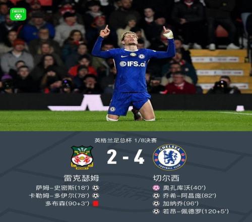 北京時(shí)間3月8日英格蘭足總杯 1/8決賽,雷克瑟姆對(duì)陣切爾西。上半場(chǎng),史密斯單刀破門,加納喬打門造烏龍。下半場(chǎng),多伊爾腳后跟破門,隨后,阿昌龐爆射破門,再次扳平。加時(shí)階段,加納喬、佩德羅先后進(jìn)球,鎖定勝局。最終比分雷克瑟姆 2-4 切爾西。
