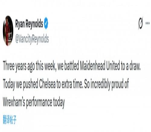 雷克瑟姆老板“死侍”瑞安·雷諾茲社媒發(fā)文:“三年前的這一周,我們與麥登赫德(目前第6級(jí)別球隊(duì))戰(zhàn)平,而今天我們將切爾西逼進(jìn)加時(shí)賽,我為雷克瑟姆今天的表現(xiàn)感到無(wú)比驕傲?!?/p>