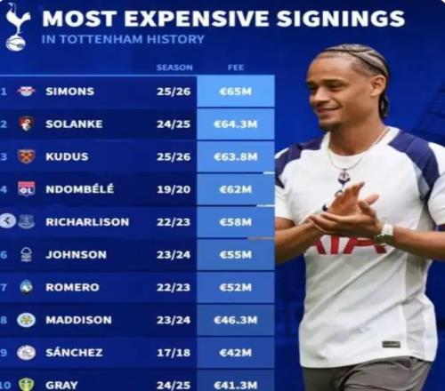 6500萬歐元,34場2球5助,身穿孫興慜留下的7號球衣。這三個數(shù)字放在一起,就是對西蒙斯本賽季最殘酷的總結(jié)。