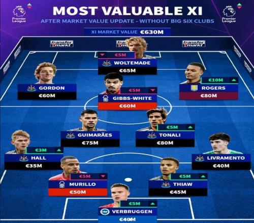 安東尼-戈登(紐卡斯?fàn)柭?lián))6000萬歐元、沃爾特馬德(紐卡斯?fàn)柭?lián))6500萬歐元(-500萬歐元)、摩根-羅杰斯(阿斯頓維拉)8000萬歐元(+1000萬歐元)
