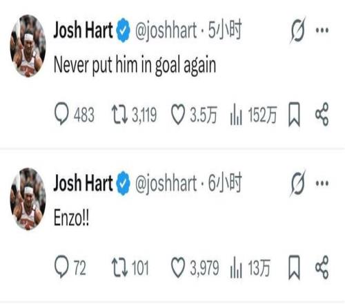 在目睹了約恩森的糟糕表現(xiàn)后,NBA紐約尼克斯后衛(wèi)、切爾西球迷約什-哈特發(fā)表社交媒體,寫道“別再讓他守門了”。