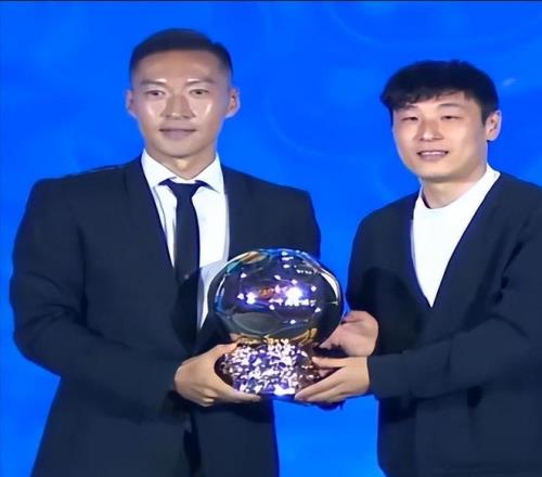 這是他繼2020年之后,職業(yè)生涯第二次捧起中國金球獎,頒獎臺上,為他頒獎的,是多年的國家隊?wèi)?zhàn)友武磊。