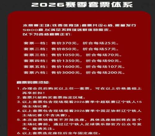 中超今年好看了,一些球隊(duì)的年票竟然比業(yè)余比賽還要便宜,絕對(duì)超值啊。2026賽季中超各隊(duì)套票價(jià)格已經(jīng)全部出爐了,散客年票價(jià)格最低的是遼寧鐵人,370元看全年,平均一場(chǎng)票價(jià)25元,球隊(duì)坐擁全中超最貴的5外援陣容,這個(gè)票價(jià)確實(shí)非常超值。