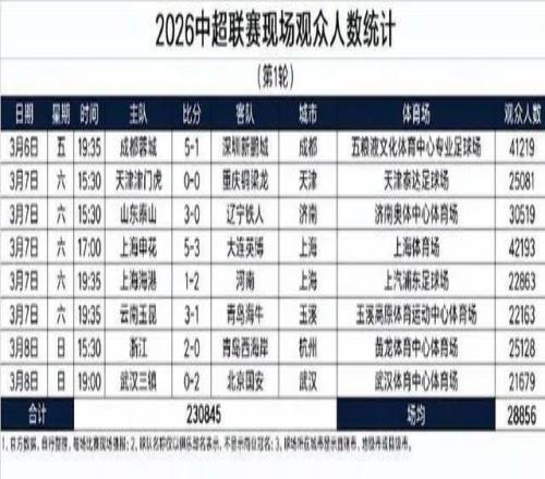 2026中超首輪戰(zhàn)罷,一個(gè)數(shù)字讓所有關(guān)心中超的人松了口氣:場均28856人。8場比賽,總計(jì)230845名球迷走進(jìn)球場,沒有一場觀眾低于兩萬人。這個(gè)近2.9萬人的場均數(shù)據(jù),放在最近幾年的聯(lián)賽環(huán)境里,稱得上是一個(gè)暖意十足的開局。