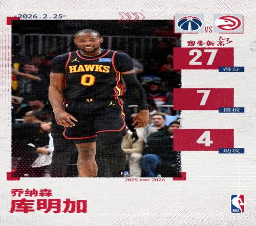 北京時(shí)間2月25日,亞特蘭大老鷹在主場以119-98大勝華盛頓奇才,收獲兩連勝。喬納森-庫明加此役迎來老鷹生涯首秀...