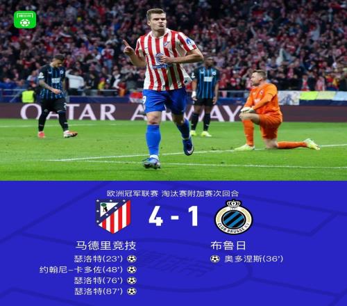 北京時間2月25日,在歐冠淘汰賽附加賽次回合的比賽中,馬德里競技主場4-1大勝布魯日,瑟洛特上演帽子戲法,約翰尼-...