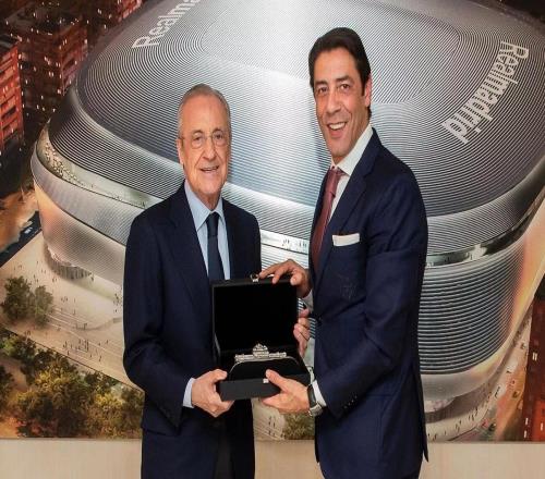 歐冠開(kāi)賽前,老佛爺與本菲卡主席魯伊科斯塔交換禮物