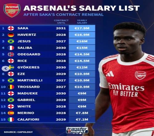 阿森納隊(duì)內(nèi)薪資排行揭秘:薩卡年薪1790萬歐領(lǐng)先,哈弗茨緊隨其后,熱蘇斯位居第三_英超直播